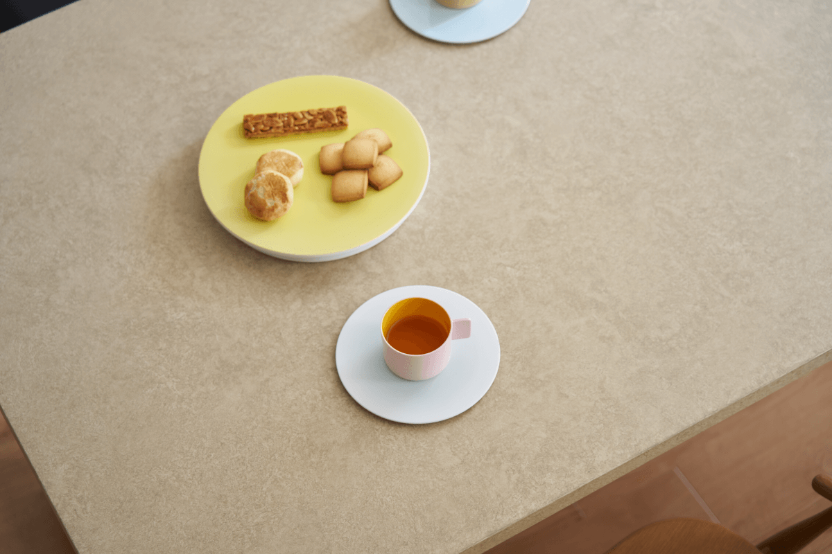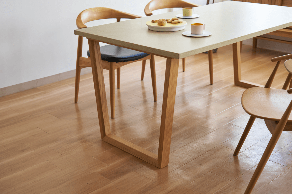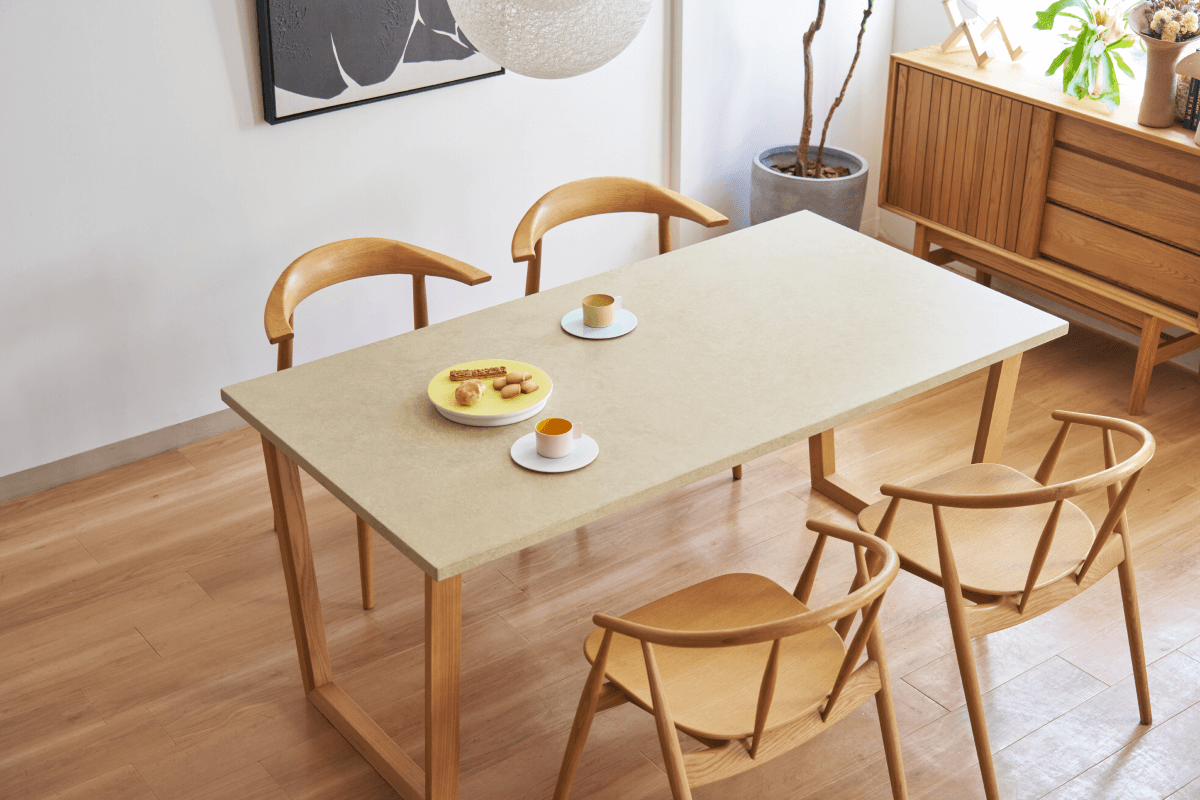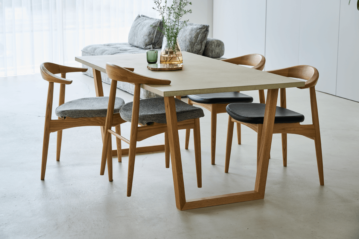 職人が手仕事で仕上げた天板は、マットで柔らかな風合い。ウッド脚との調和で、どんなお部屋にも馴染みます。モルタル風の重厚感がありながら、軽量で撥水性に優れているためお手入れも驚くほど簡単です。デザイン性と日々の使い勝手、その両方を妥協したくない方にこそ、ぜひ選んでいただきたい名品です。