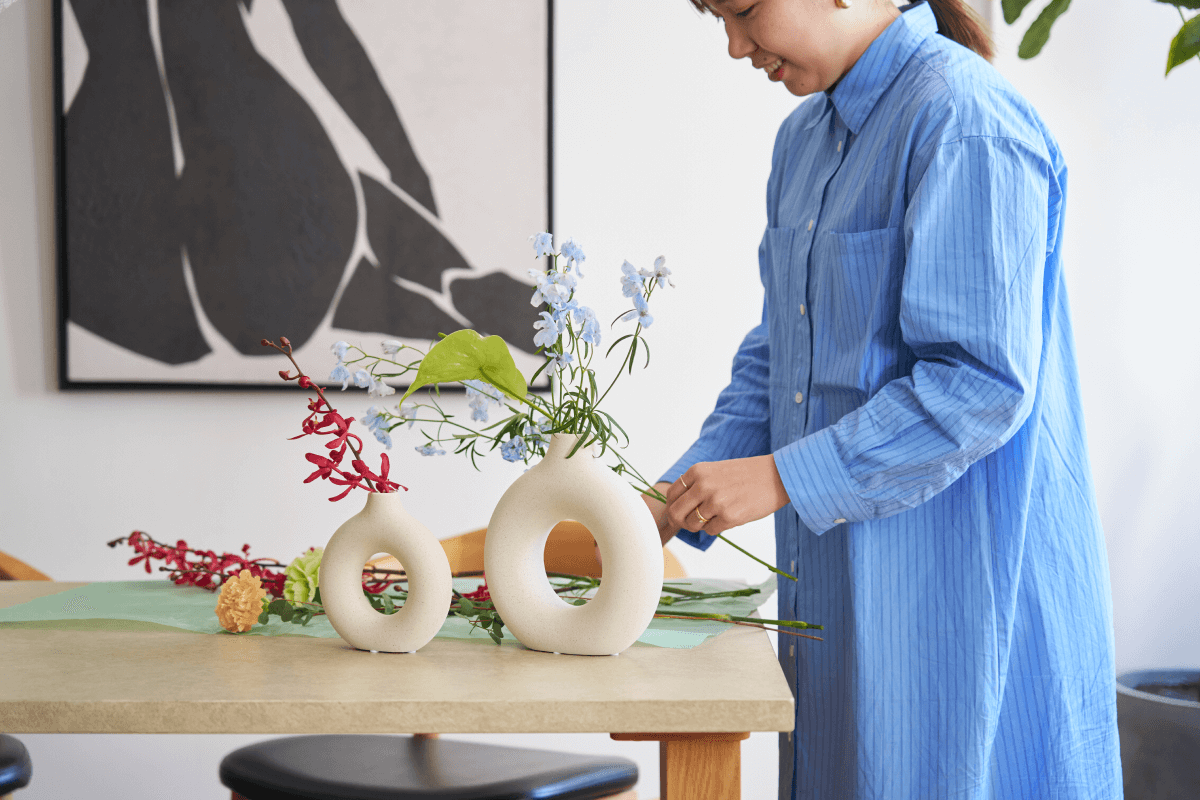 花を活けなくても絵になる人気アイテム。生花やドライフラワーとも相性が良く、北欧・モダン・ナチュラルなど幅広いインテリアテイストに対応します。置くだけで空間に抜け感とリズムがうまれる、おすすめのベースです。