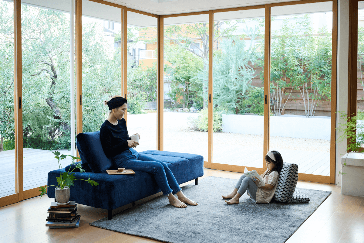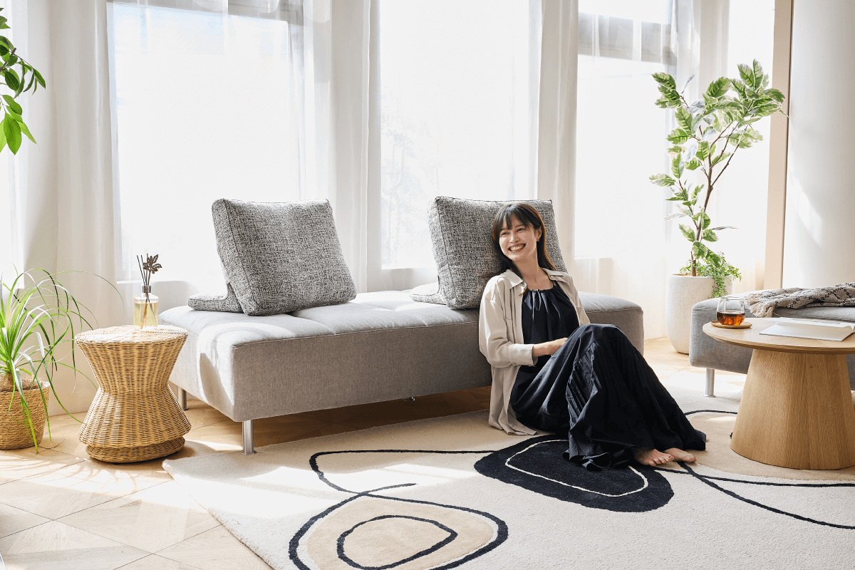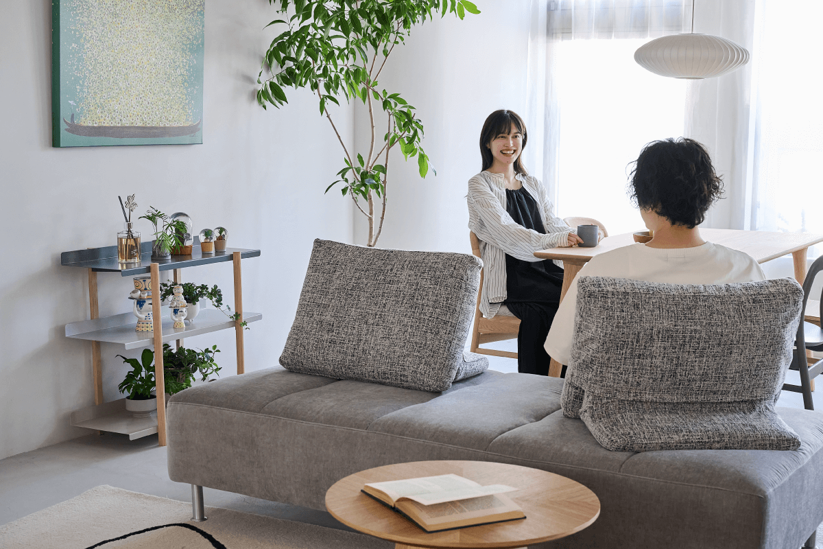 座る・寝転ぶ・寄り添う。背クッションを動かすだけで、くつろぎ方を変えられるソファとして、何度も調整を重ねて出来上がったソファです。汚れに強いアクアクリーン生地もこだわりの1つ。家族の時間を受け止める包容力のあるソファとして、日常を少し特別にしてくれます。